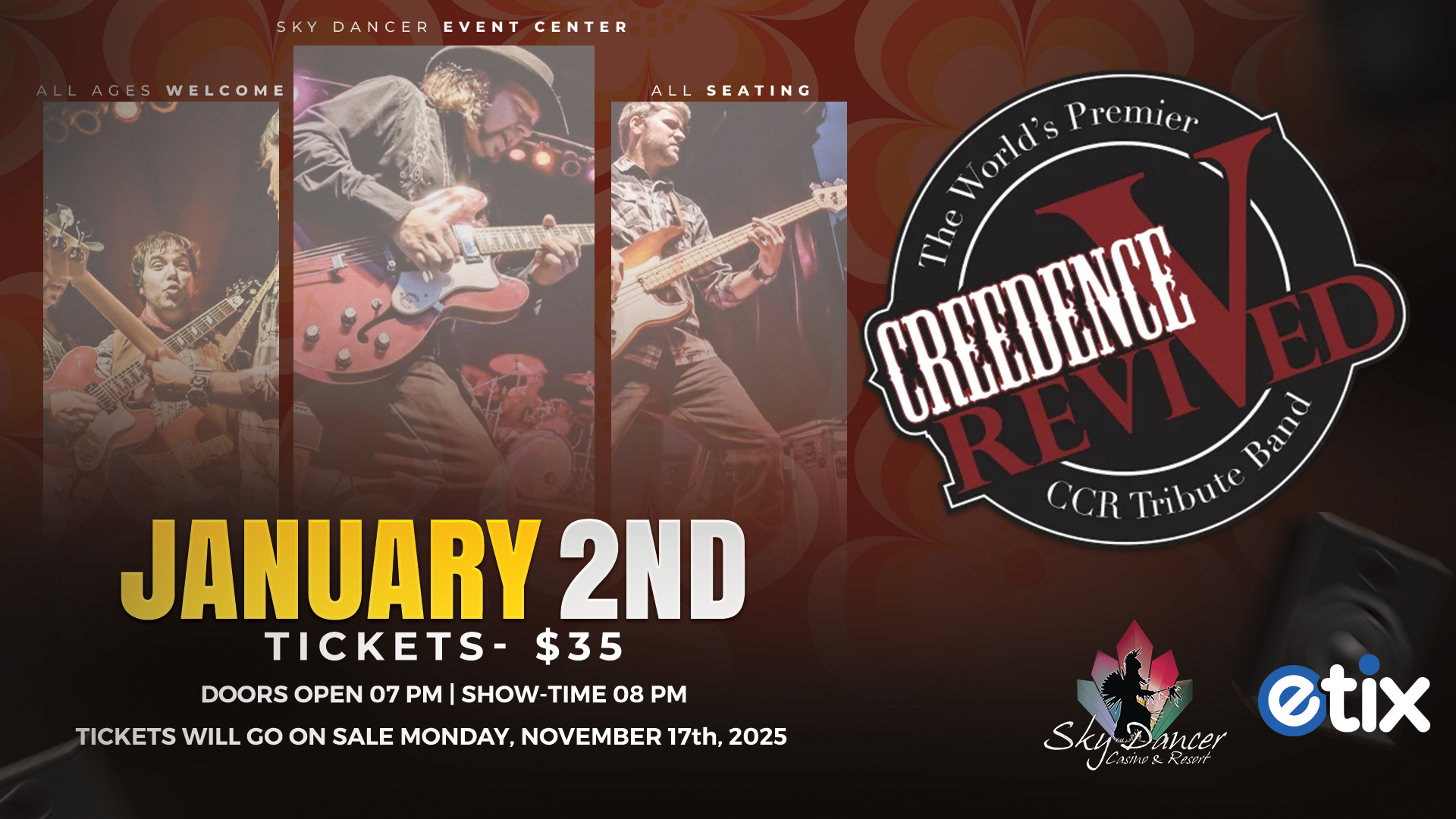 « All Events Creedence Revived January 2, 2026 @ 7:00 pm - 9:30 pm Details Date: January 2, 2026 Time: 7:00 pm - 9:30 pm Website: https://www.etix.com/ticket/p/40264254/the-frontmen-belcourt-sky-dancer-casino Organizer ND Country Fest View Organizer Website Venue Sky Dancer Casino 3965 Sky Dancer Way NE Belcourt, ND 58316 United States + Google Map Phone 17012442400 Add to calendar Google Calendar iCalendar Outlook 365 Outlook Live Details Date: January 2, 2026 Time: 7:00 pm - 9:30 pm Website: https://www.etix.com/ticket/p/40264254/the-frontmen-belcourt-sky-dancer-casino Organizer ND Country Fest View Organizer Website Venue Sky Dancer Casino 3965 Sky Dancer Way NE Belcourt, ND 58316 United States + Google Map Phone 17012442400